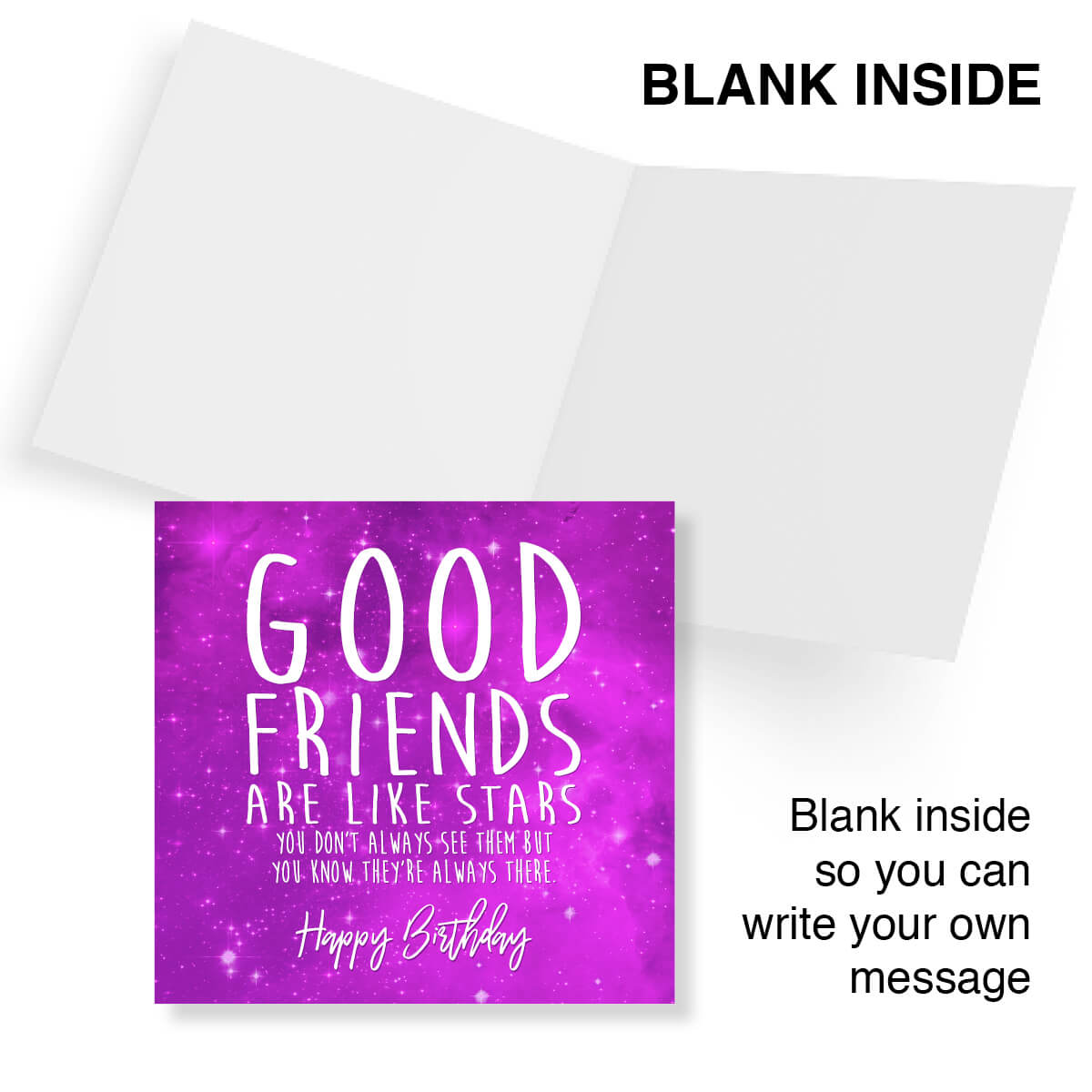 Celebrate your female friend's birthday with this beautiful and meaningful special friend birthday card female! Featuring a square design with a stunning purple galaxy background, the card reads, "Good friends Are Like Stars You Don’t Always See Them But You Know They’re Always There. Happy Birthday." Perfect for showing appreciation for a cherished friend, this birthday card for women captures the essence of true friendship. It comes with a white envelope for easy gifting. Make her day extra special with this heartfelt and visually striking good friend birthday card female!