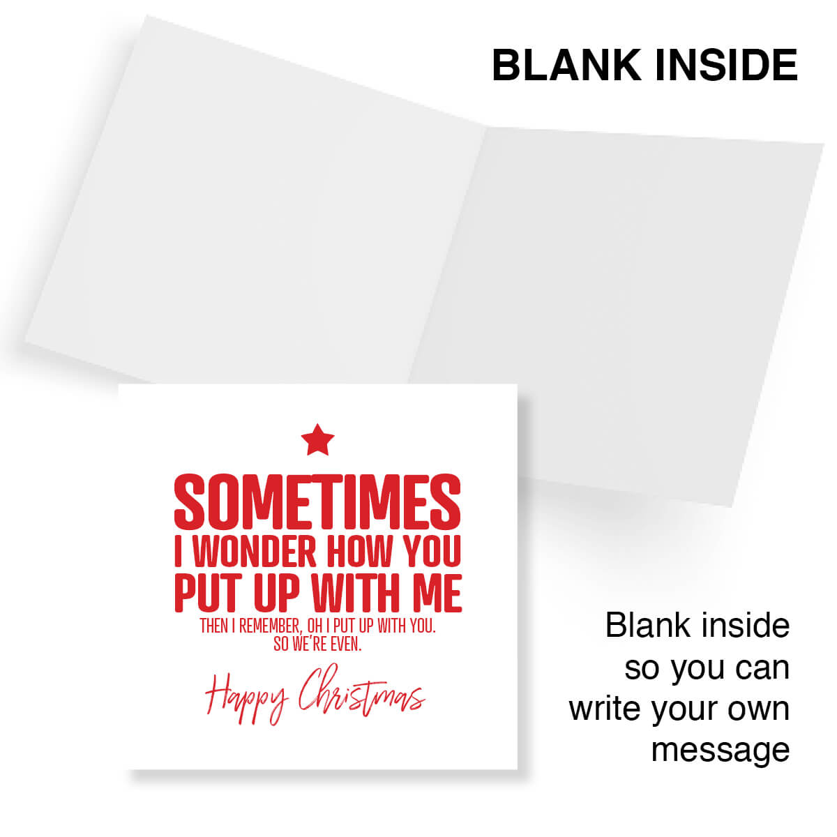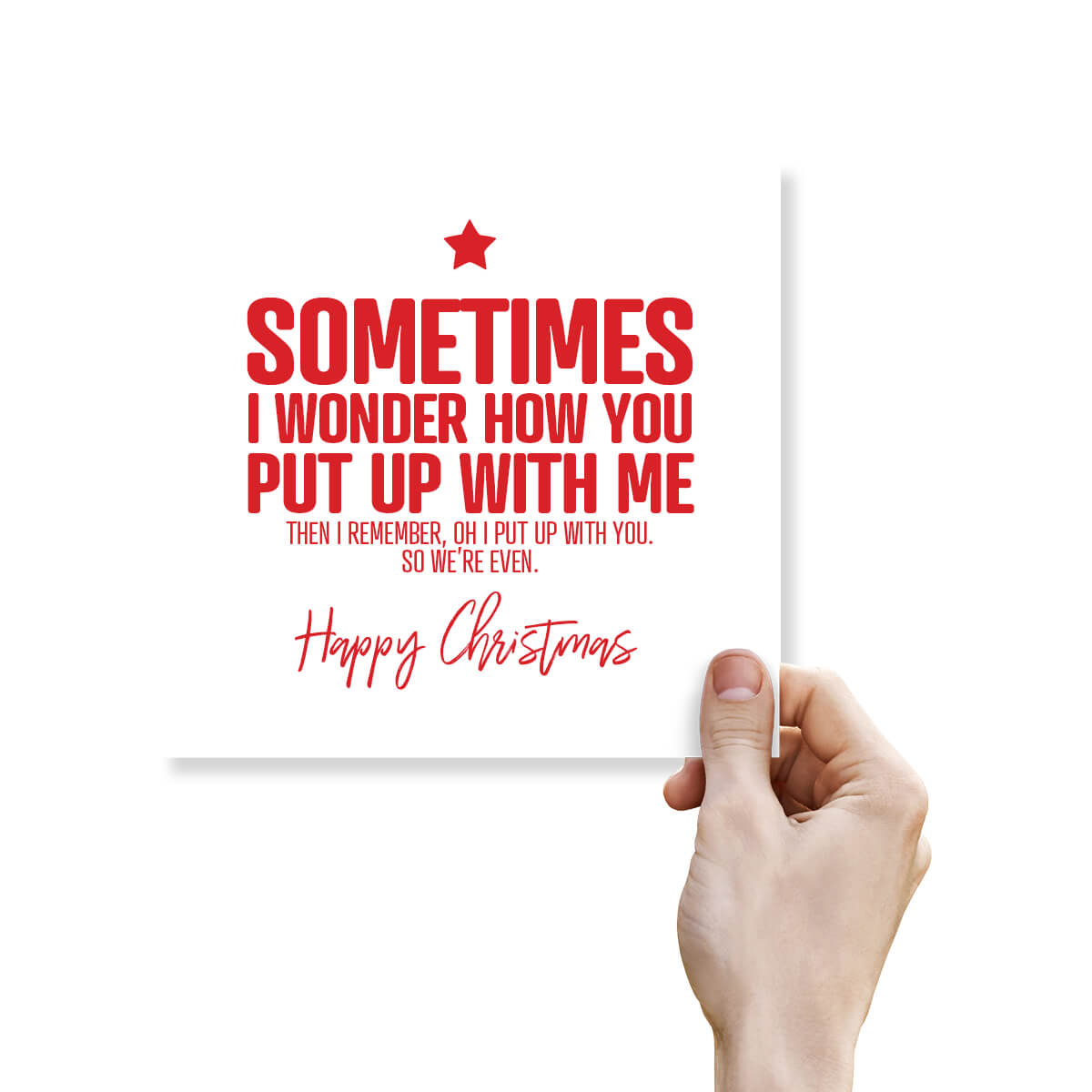 Introducing the "Sometimes I Wonder" Boyfriend Christmas Card – a witty and light-hearted way to bring a smile and laughter to the holiday season! This square card with its white background and bold red typography is a perfect choice for couples who enjoy a playful and humorous exchange during the festivities. A perfect Husband Christmas Card.