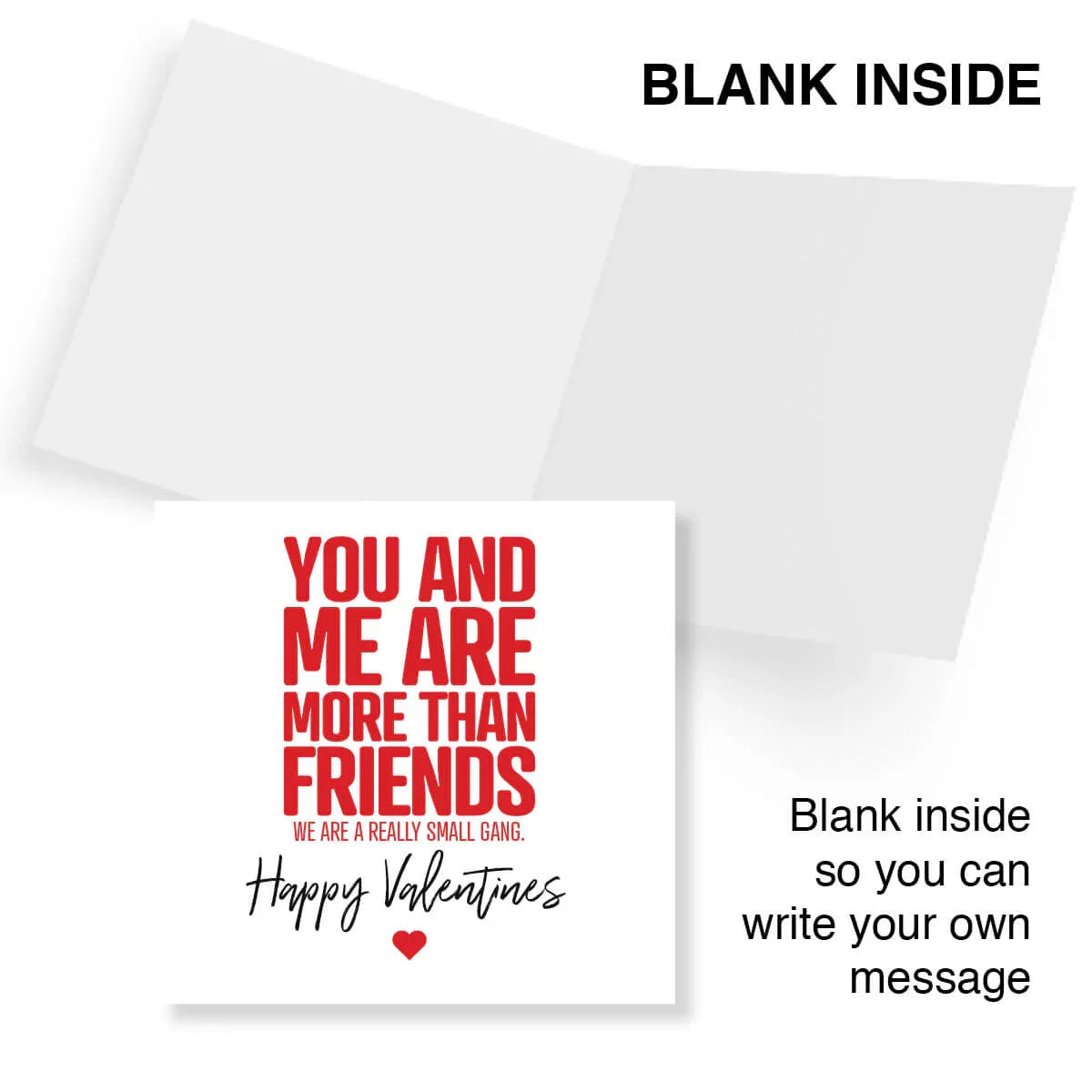 This funny Valentine's Day card reads: 'You And Me Are More Than Friends. We Are A Really Small Gang.'. Perfect for partners who love humour, cheeky messages and a light‑hearted Valentines surprise. Printed on premium card with a bold red envelope.