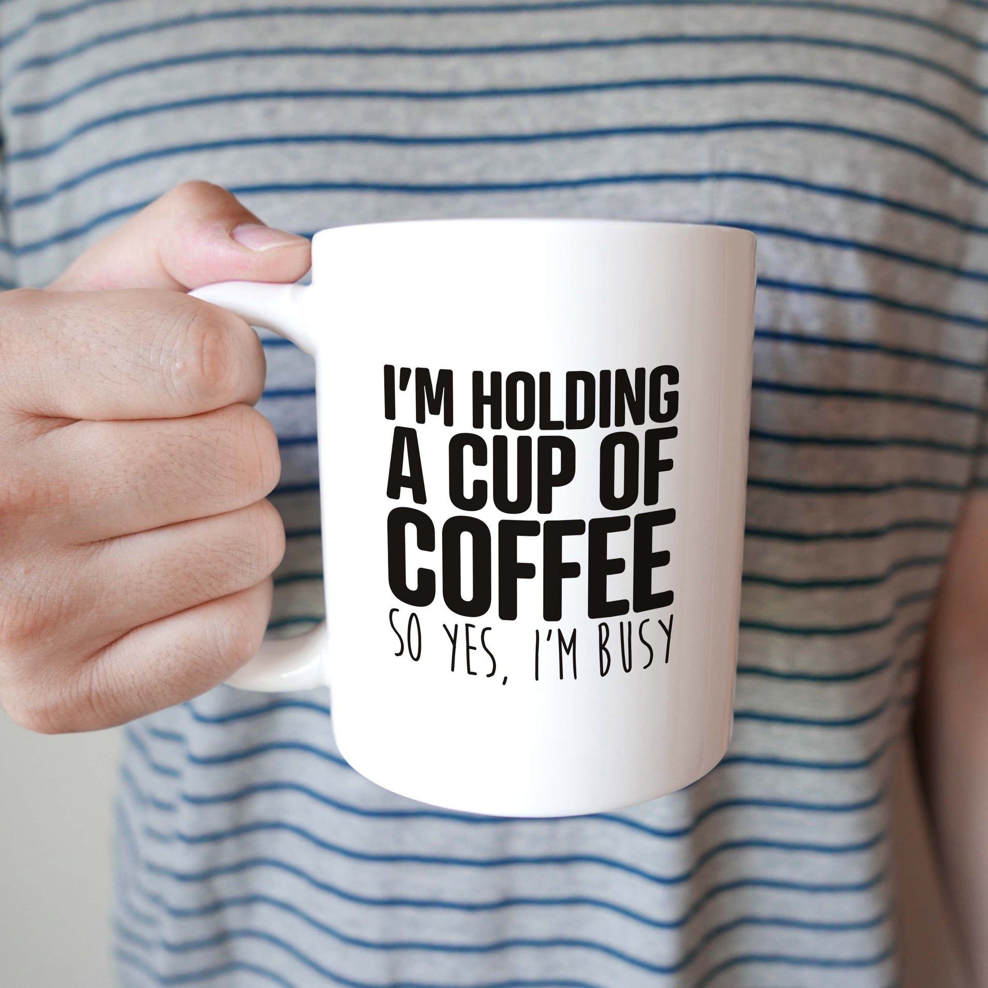 Looking for a hilarious gift for your co-worker? This white ceramic mug with bold black text that reads "I'm holding A cup of coffee" is sure to bring a smile (or laugh) to there face!