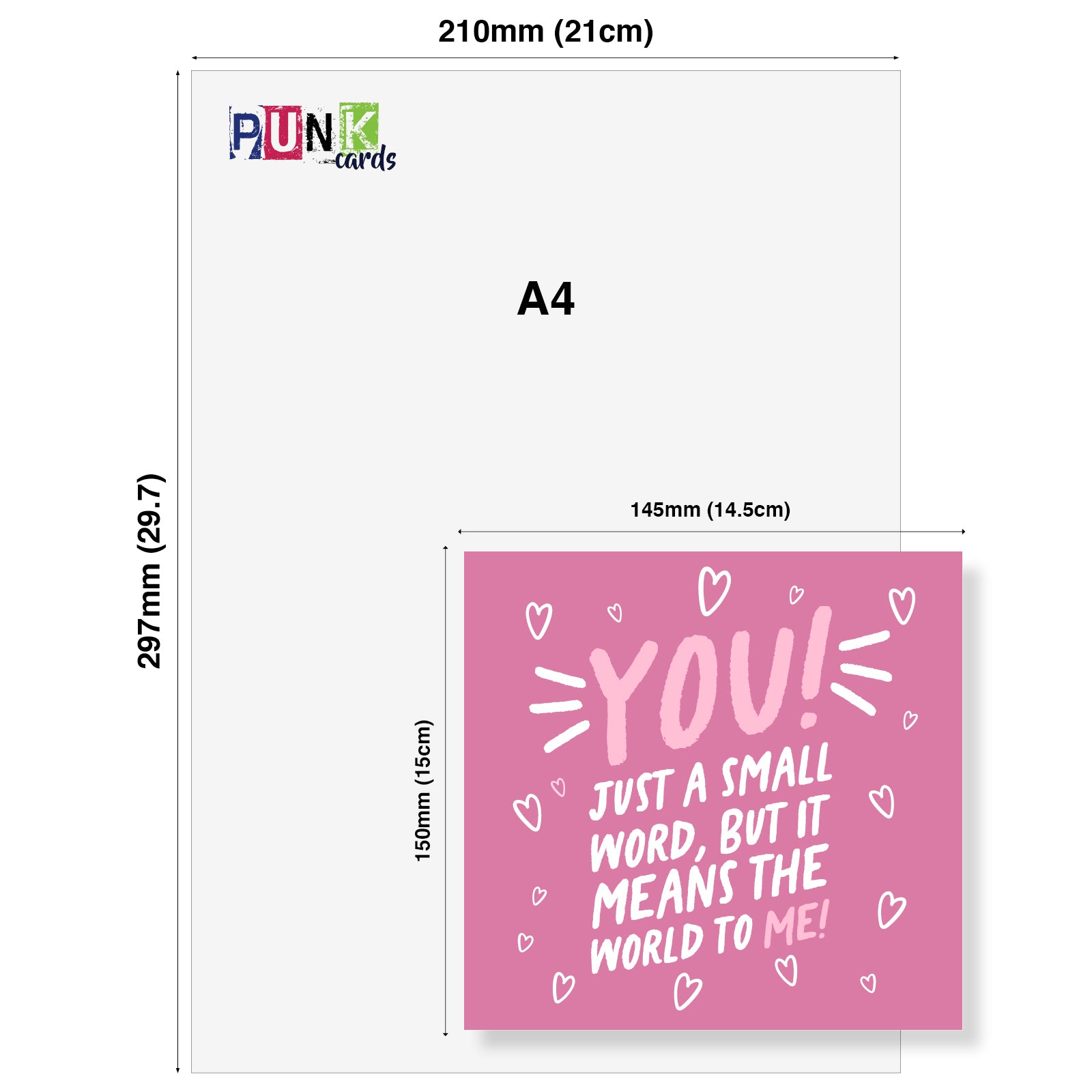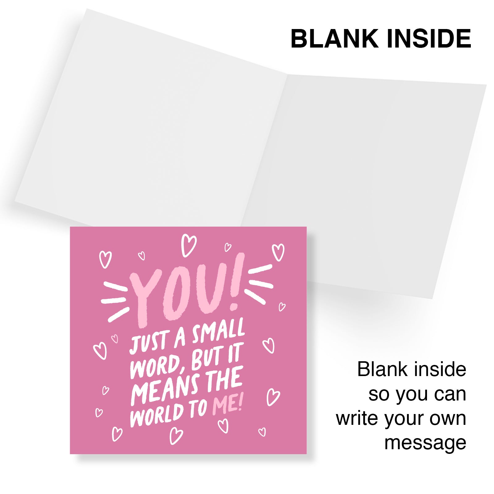 Show your wife or girlfriend how much she means to you with this heartfelt Valentine's Day card. Featuring the touching message, ‘You! Just a small word, but it means the world to me!' on a vibrant pink background with playful white heart accents, this card is the perfect way to express your love and appreciation on this special day.