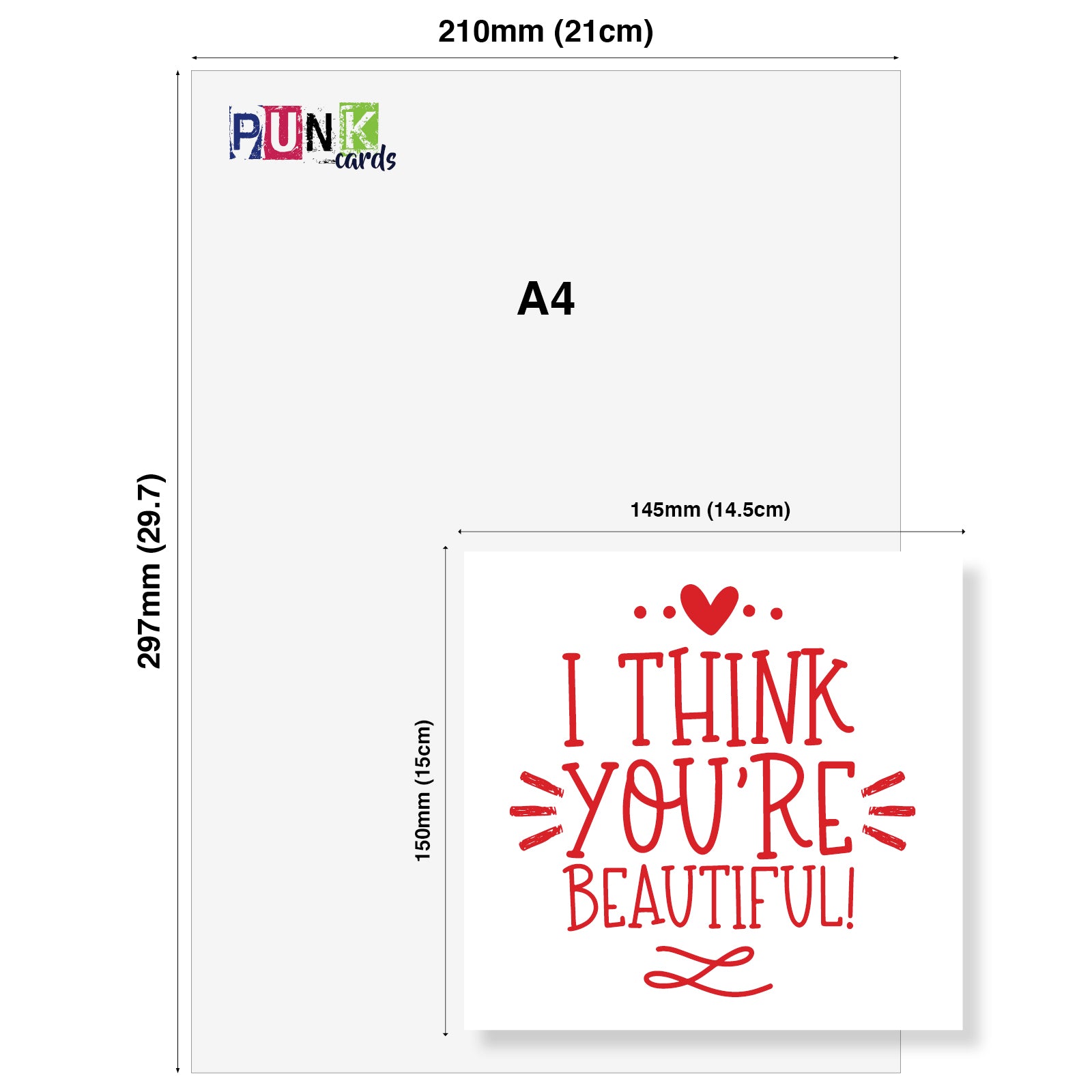 Make your wife or girlfriend feel special this Valentine's Day with this romantic card featuring the heartfelt message, 'I Think You're Beautiful!' The bold red text and charming design with a heart accent on a crisp white background make it the perfect way to express your love and admiration. A thoughtful card to make her day unforgettable!