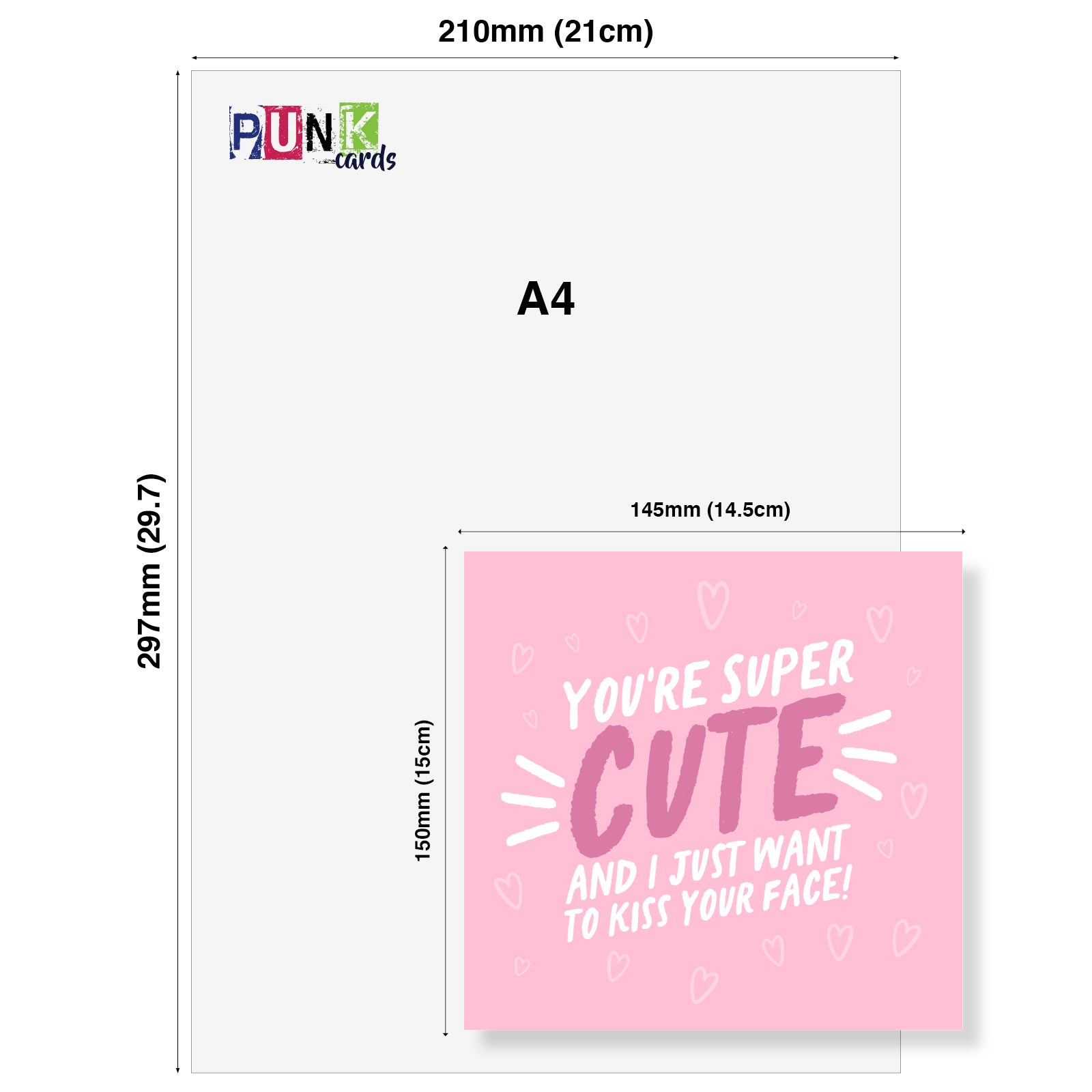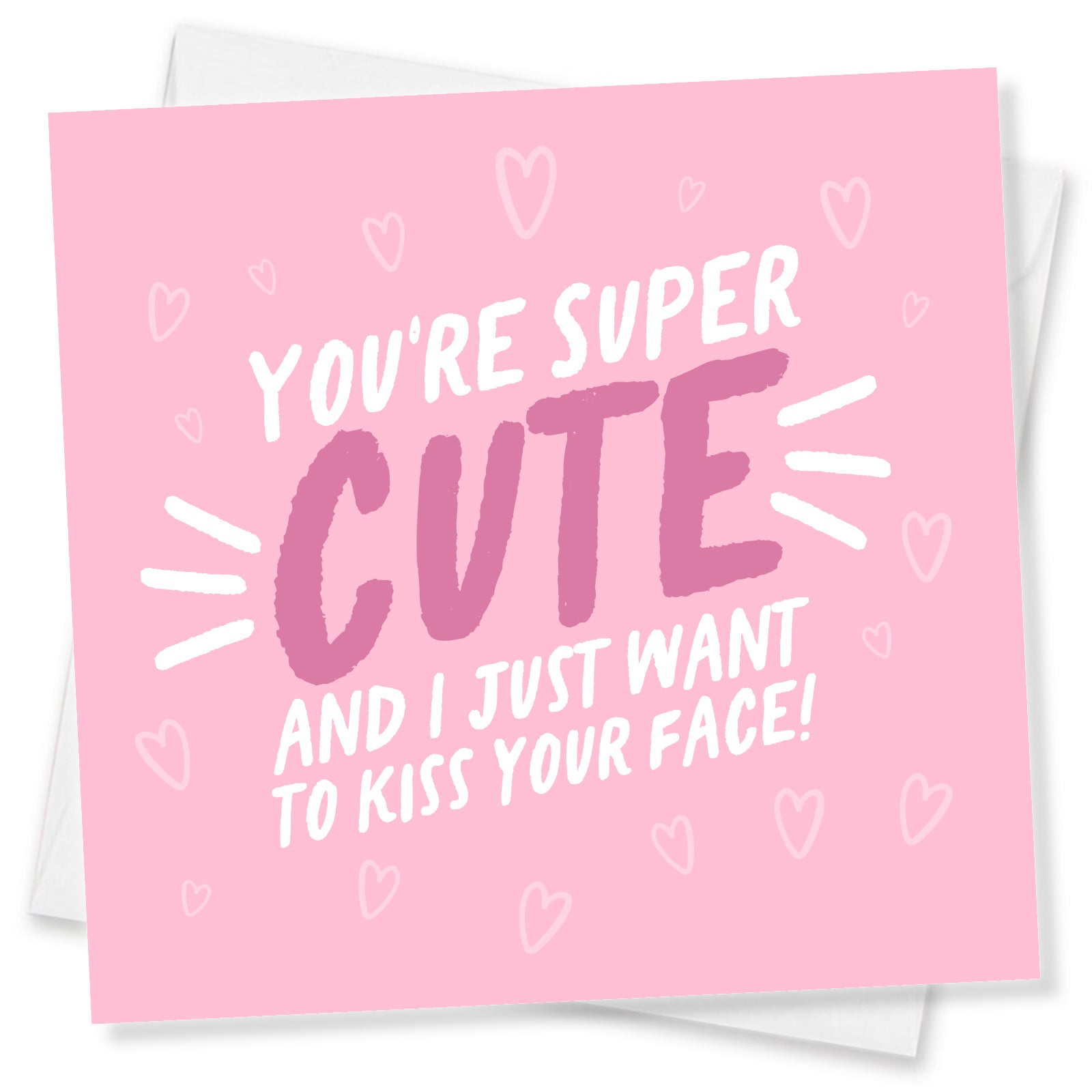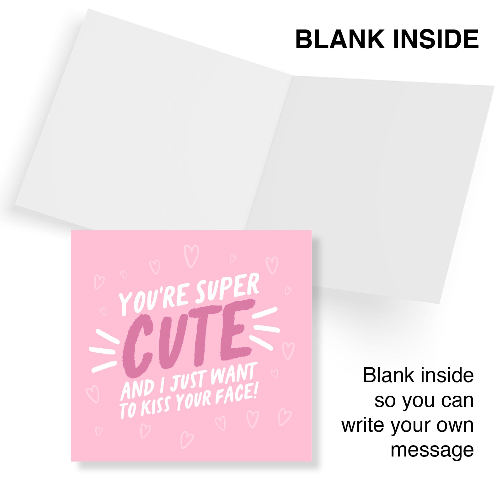 Bring a smile to your wife or girlfriend's face this Valentine's Day with this adorable card featuring the playful message, 'You're Super Cute And I Just Want To Kiss Your Face!' Set against a soft pink background with sweet heart accents, this card is perfect for sharing your affection in a fun and romantic way. The ideal choice to make her feel loved and cherished!
