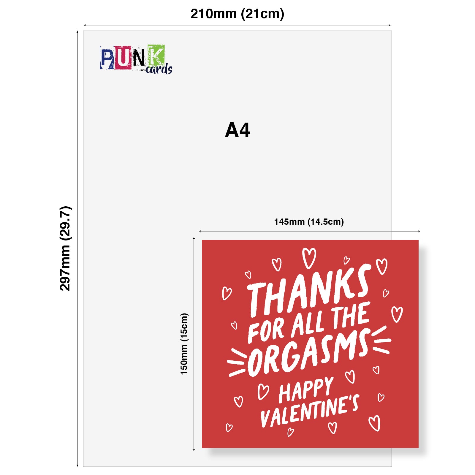 Add a cheeky touch to your Valentine's Day with this hilarious card featuring the bold message, 'Thanks For All The Orgasms. Happy Valentine’s’ Perfect for your girlfriend, boyfriend, wife, or husband, this card is a playful way to show appreciation with a sense of humour. Set against a vibrant red background with fun heart accents, it's guaranteed to bring a laugh and make this Valentine's Day unforgettable!
