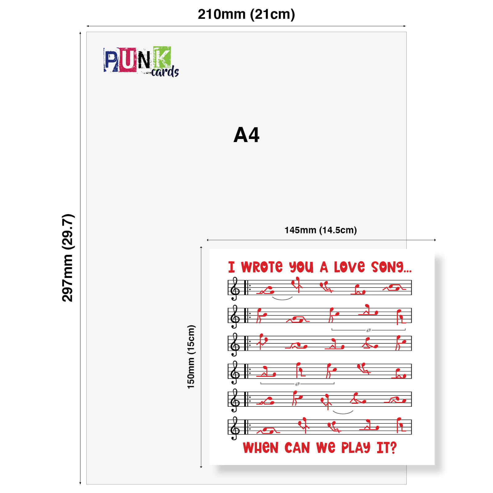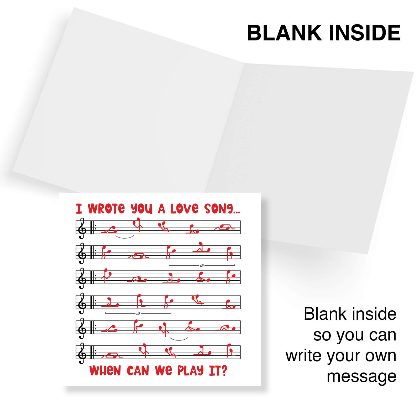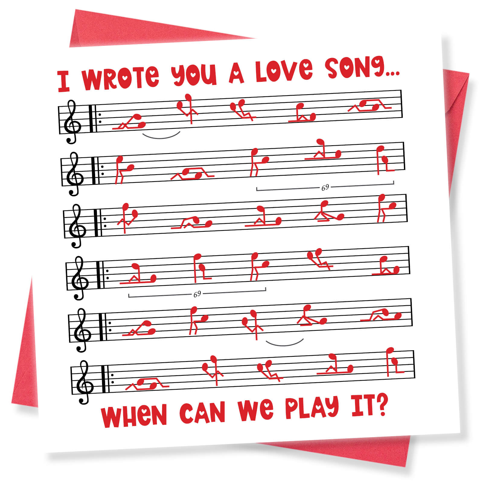 Spice up Valentine’s Day with this **funny and cheeky "I Wrote You a Love Song… When Can We Play It?" greeting card**! Featuring a creative and playful musical score with suggestive stick figure illustrations, this card is perfect for **boyfriends, girlfriends, husbands, and wives** who love humour and romance. Whether for **Valentine’s Day, anniversaries, or just because**, this bold and flirtatious card is sure to make them smile! **Order now** and turn up the heat!