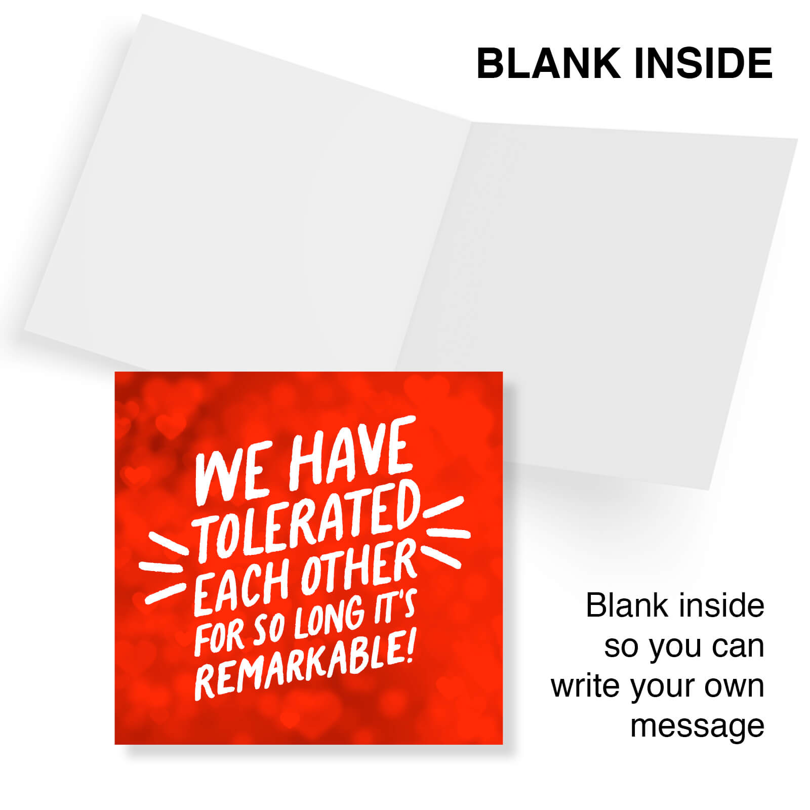 Celebrate love with humour! This "We Have Tolerated Each Other for So Long It's Remarkable!" Valentine's Day card is perfect for couples who love to joke around. Featuring bold typography on a vibrant red background, this funny and sarcastic greeting card is great for husbands, wives, boyfriends, girlfriends, and long-term partners. Whether for Valentine’s Day, anniversaries, or just because, this lighthearted card will make them laugh! Order now and share the love (and the laughs)!
